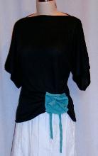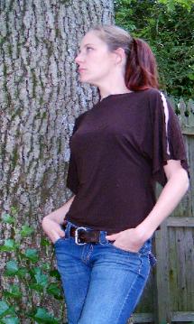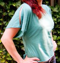 Tee shirts have bateau / boat neck styling. Split kimono sleeve hits just above elbow crease and is
